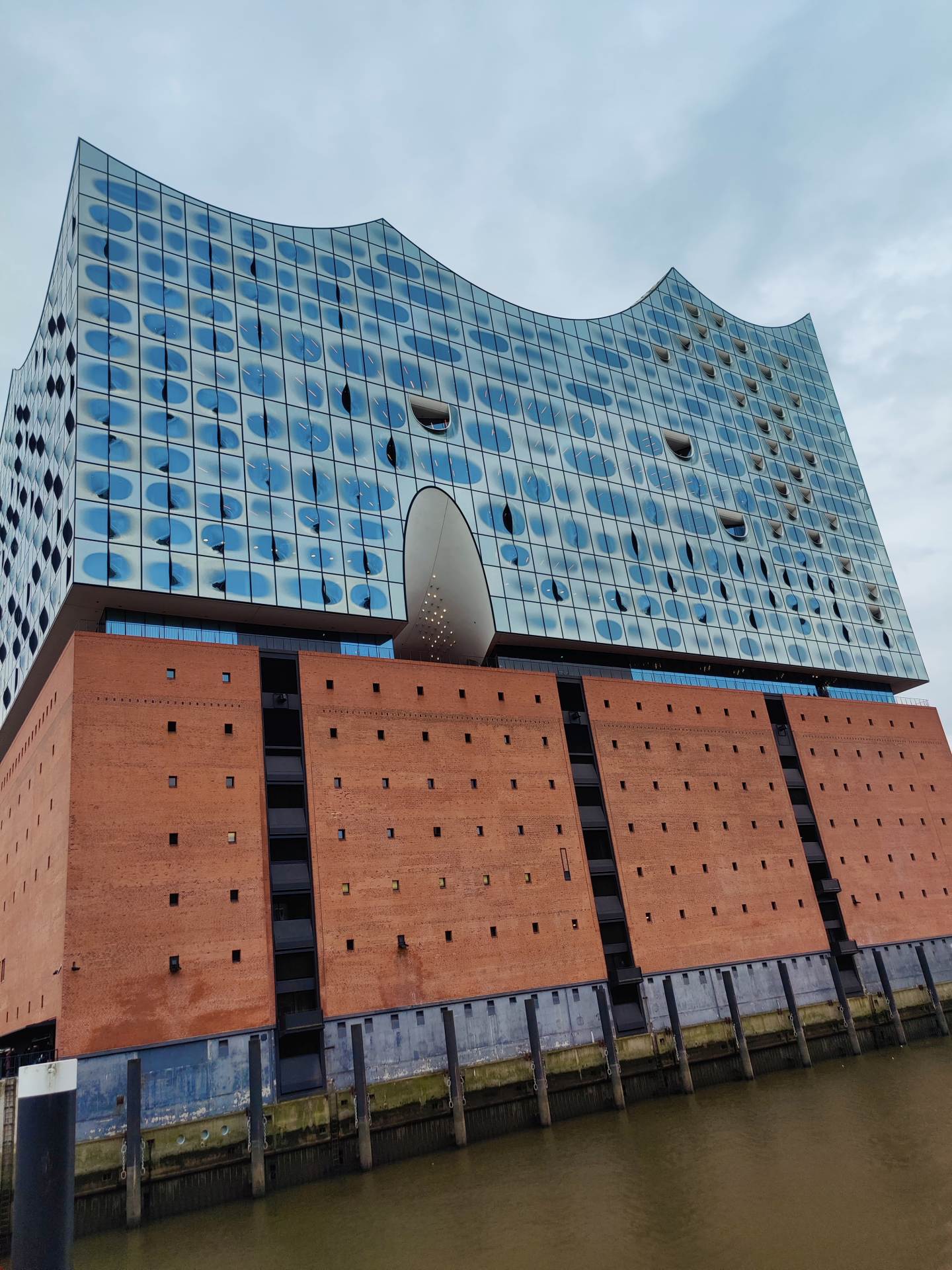 ייחודו של המבנה הוא בשילוב יוצא דופן בין ישן לחדש. קומותיו התחתונות נבנו על בסיס מחסן ישן מלבנים אדומות ששימש בעבר לאחסון קקאו, תה וטבק. מעל המבנה ההיסטורי הזה נבנתה תוספת מרהיבה מזכוכית, בעלת קווים גלים המזכירים מפרש, גל או גביש קרח. העיצוב המיוחד מעניק לבניין מראה איקוני שנראה כמעט מכל נקודה בעיר, במיוחד כאשר קרני השמש נשברות על חזית הזכוכית. את המבנה תכנן משרד האדריכלים השווייצרי הרצוג ודה־מרון (Herzog & de Meuron).